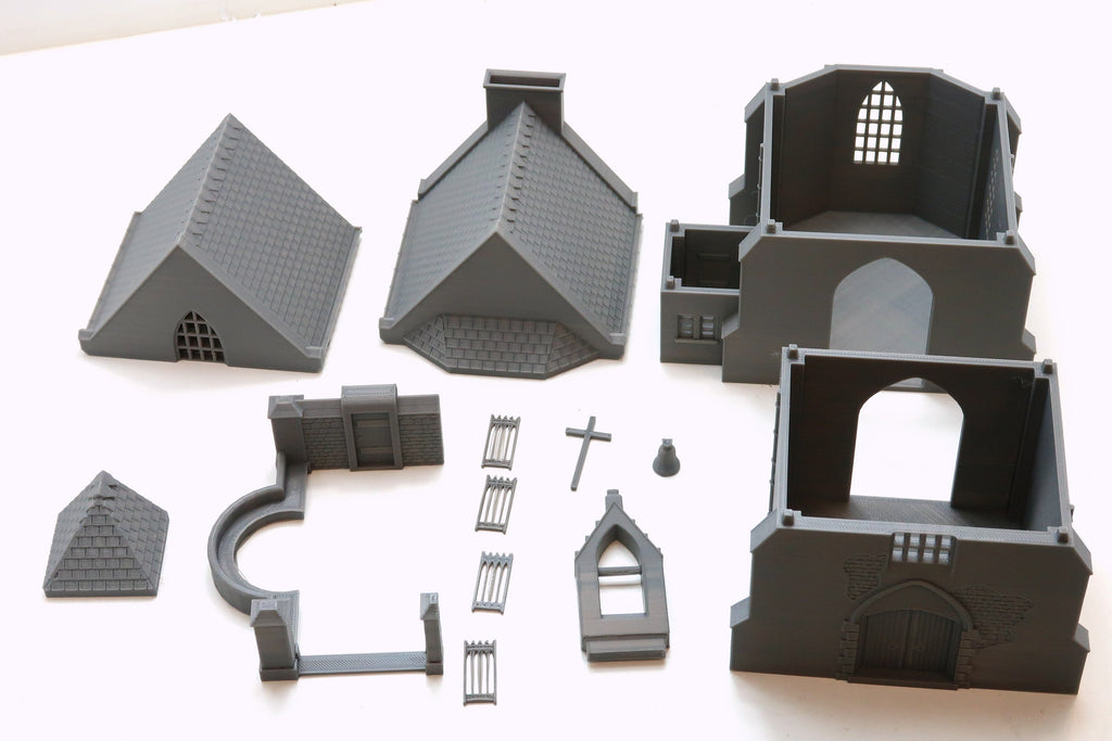 The building is unpainted and unprimed. I do the cleanup, but some tiny fibers may still be present. It may come in grey or black. Each building is created from stackable sections as shown in the images.