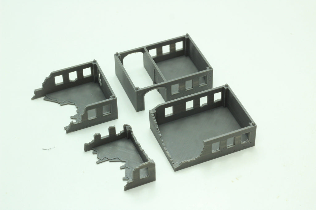 All buildings are unpainted and unprimed. I do the cleanup, but some tiny fibers may still be present. It may come in grey or black. Each building is created from stackable sections as shown in the images.