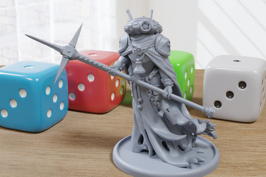 Summon prophecy and steel onto your tabletop with this Grimdark Oracle, a mysterious warrior-seer armed with a long ceremonial polearm and a haunting techno-relic headpiece. With a flowing cloak, layered armor, and iconic details, this miniature is perfect as a commander, elite champion, prophet, or unique hero model for dark trench warfare and grim fantasy campaigns.