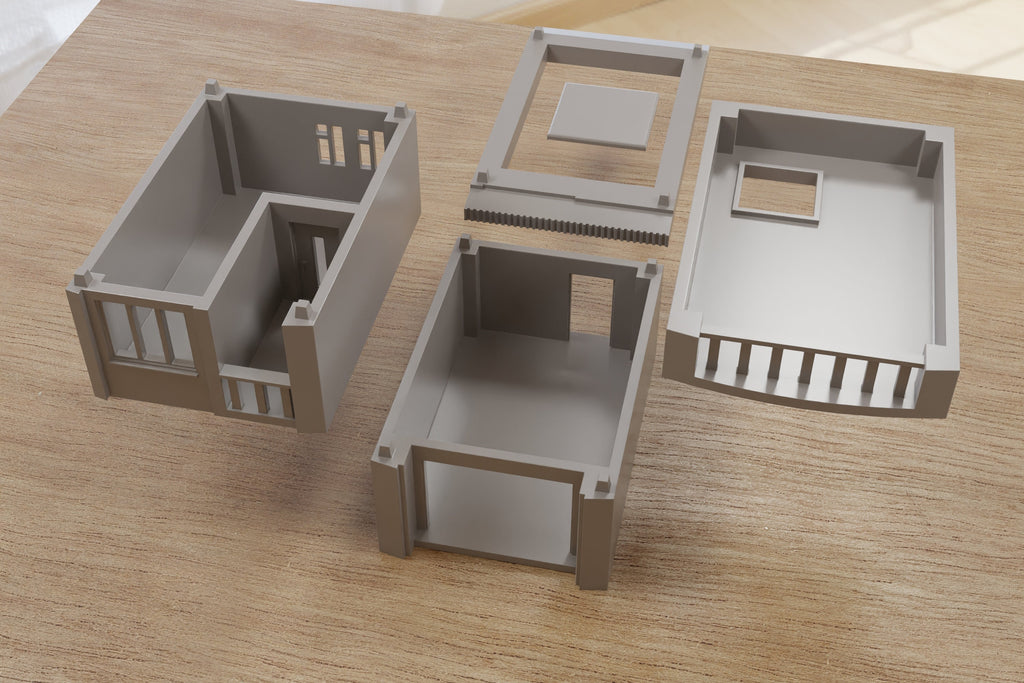 All parts are unpainted and unprimed. I do the cleanup, but some tiny fibers may still be present. It may come in grey or black. A building is created from stackable sections, as shown in the images.
