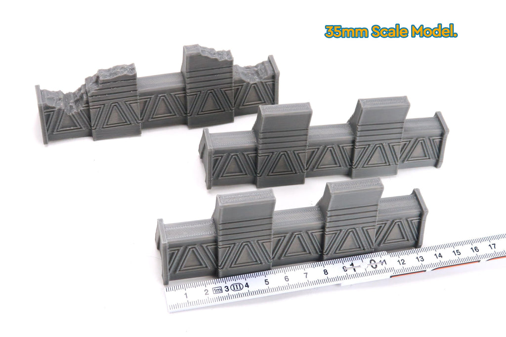 This set includes three modular wall pieces, two intact and one battle-damaged, perfect for creating defensive lines, chokepoints, and cover for advancing troops. Each section features clean geometric paneling inspired by galactic military architecture, giving your table both cinematic visuals and tactical depth.