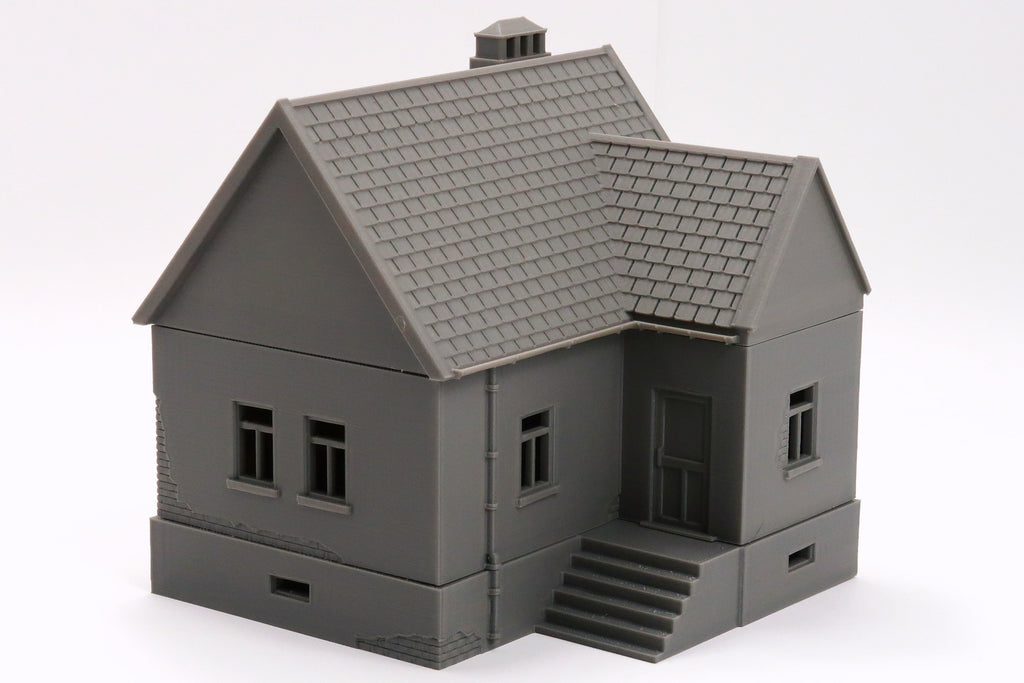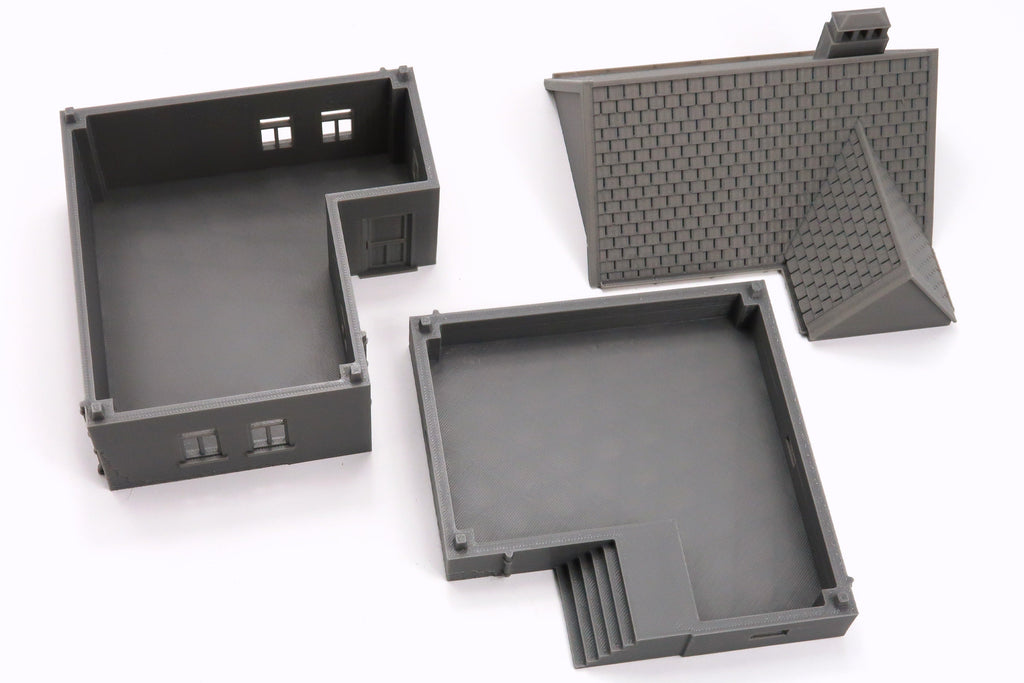 Tous les bâtiments sont non peints et non apprêtés. Je nettoie le tout, mais il peut rester quelques fibres. Le matériau peut être gris ou noir. Chaque bâtiment est constitué de sections empilables, comme le montrent les images.