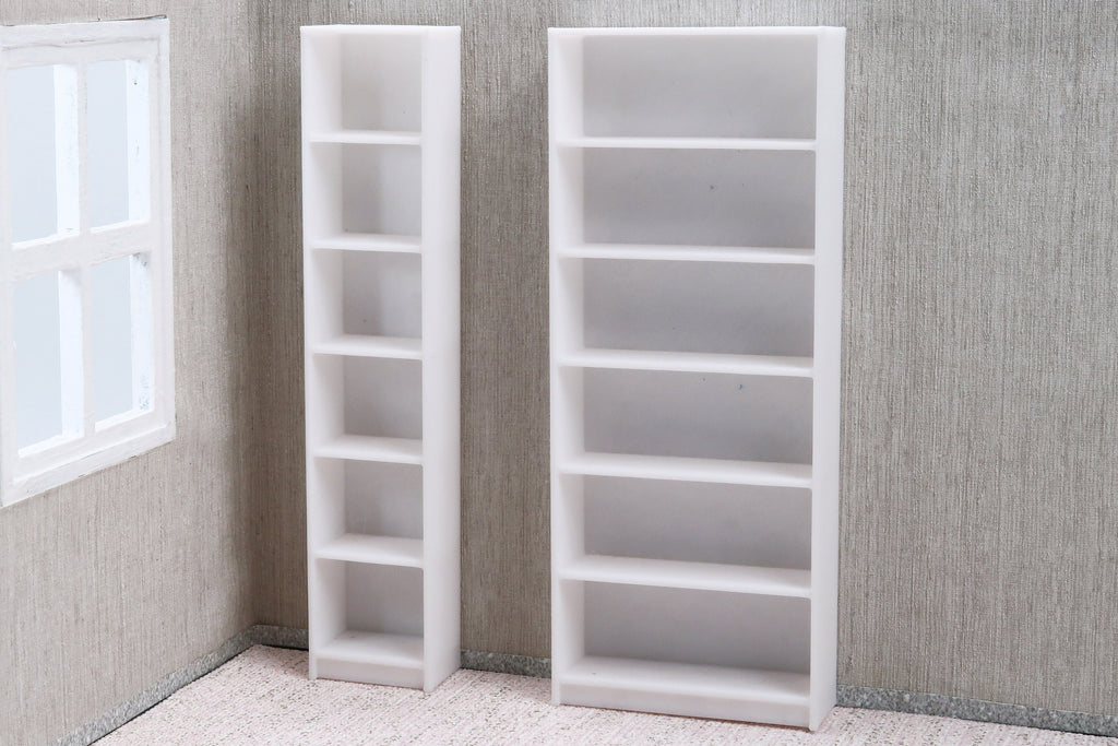 Les images montrent une bibliothèque imprimée en 3D, blanche et à l'échelle 1/12 ; la poupée mesure 15 cm de haut.