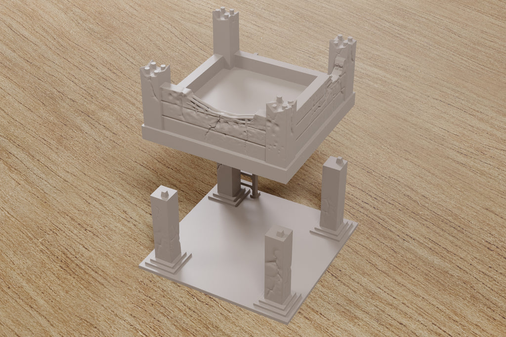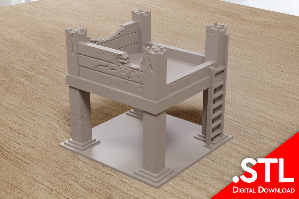 The model features cracked concrete textures, reinforced pillars, and a raised platform accessible by ladder, perfect for snipers, lookouts, or ambush points. Its open structure provides both line-of-sight blocking and elevated cover, making it a versatile centerpiece for skirmish games.