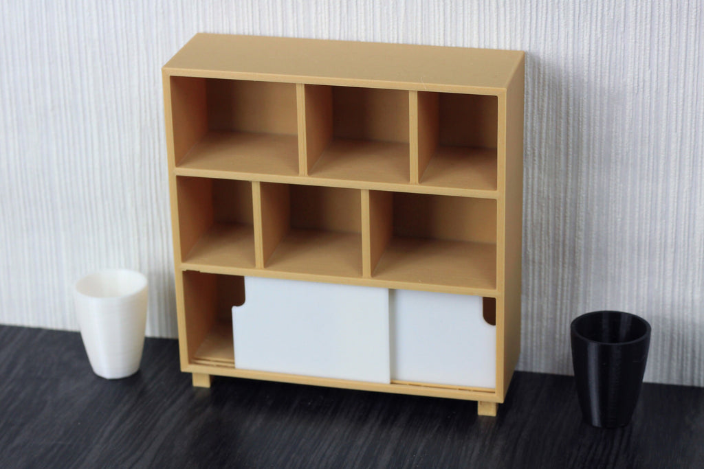 This Modern Bookshelf with Sliding Doors is indispensable in your modern dollhouse design.