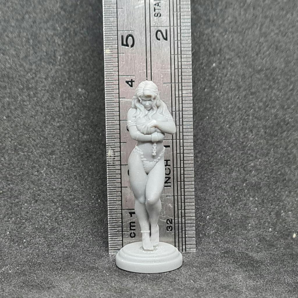 This Slave Girl miniature is a detailed fantasy figure designed for painting, collecting, and display. Her expressive pose and ornamental accessories suggest a character with a story to tell — ideal for narrative tabletop setups, role-playing games, and dioramas.