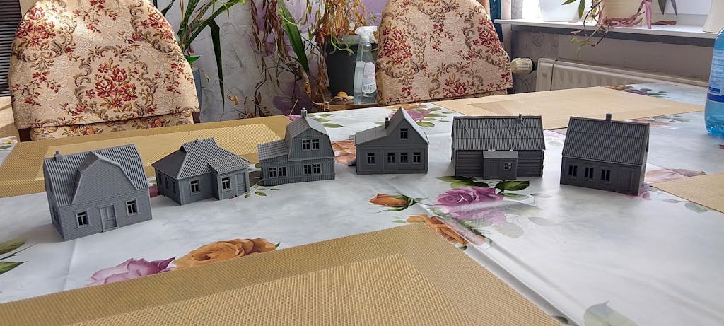 The images display the 20mm (1/72). All buildings are unpainted and unprimed. I do the cleanup, but some tiny fibers may still be present. It may come in grey or black.